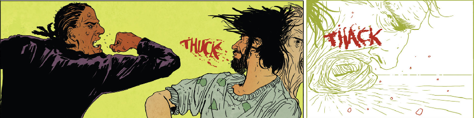 Embracing chaos, another story: Sloane turns in the colors for #4 and I look at it and eventually realize that I need to cut twelve pages of text from the comic entirely - simply because the storytelling was so strong that there was no need for words. It's all good until we are two days away from going to print and I count the pages and realize we made a rookie mistake and the pages don't follow the left/right scheme properly, which means most of the two-page spreads will be cut in half instead of presented properly. So I create two empty pages that balance everything out and then have to come up with text…which proves crucial to the end of the story and makes me rewrite most of #4 once more.